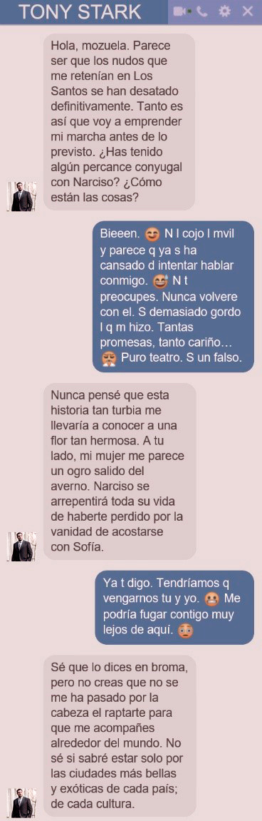 BELINDA: Quería llamarte, pero se me ha muerto el móvil. Sabía que andabas por aquí, y pensaba darte una sorpresa, pero la recepcionista no me ha dejado entrar en la convención, la muy guarra.GERMÁN: Es que no tienes aspecto de una profesional de la automoción.BELINDA: Da igual. Le he dicho que venía a ver a mi tío, Tony Stark, pero no me ha creído. Me ha dicho que no estaba invitada, y me quería cobrar un pastizal por la entrada. No llevo mucho dinero encima, y luego… El puto móvil…GERMÁN: ¿Te has quedado sin batería?BELINDA: !Qué vaaah! Si está a tope. No sé qué le ha pasado; y no se reinicia.
