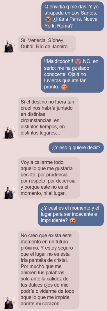 ROMINA: Espero que ese tío de verdad te merezca.BELINDA: Él tampoco tiene desperdicio.ROMINA: No me refiero solo a su físico cuando hablo de sus méritos.BELINDA: Ya lo sé, pero siempre ayuda. Es muy competitivo, eso sí; demasiado.ROMINA: Entonces, espero que se dé cuenta de que tú eres su mayor triunfo.BELINDA: Más le vale tenerlo presente. No… … te digo que es un tío alucinante.