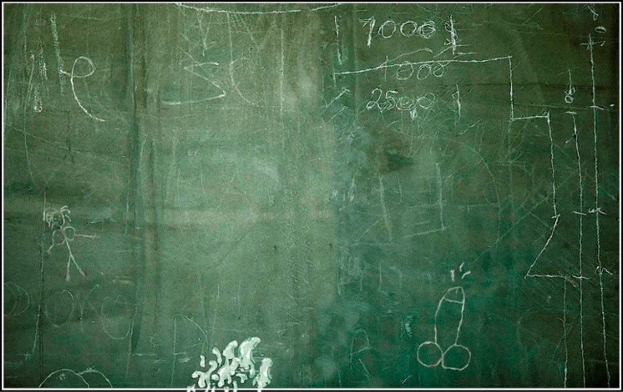 La luz natural que se proyecta a través de las ventanas rotas de la clase dibuja la sombra de aquella asimétrica pareja sobre una pizarra emborronada que lleva mucho tiempo en desuso.
